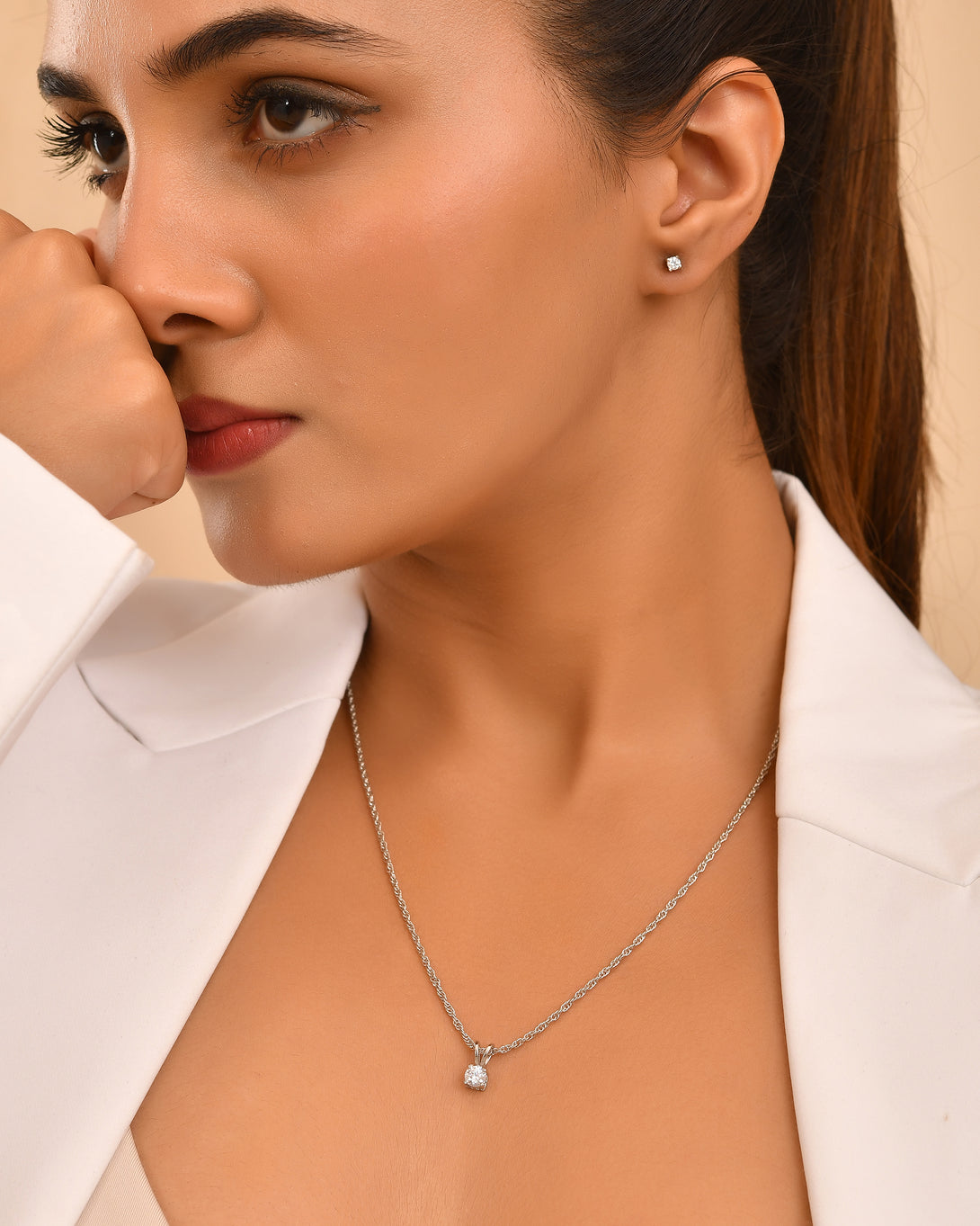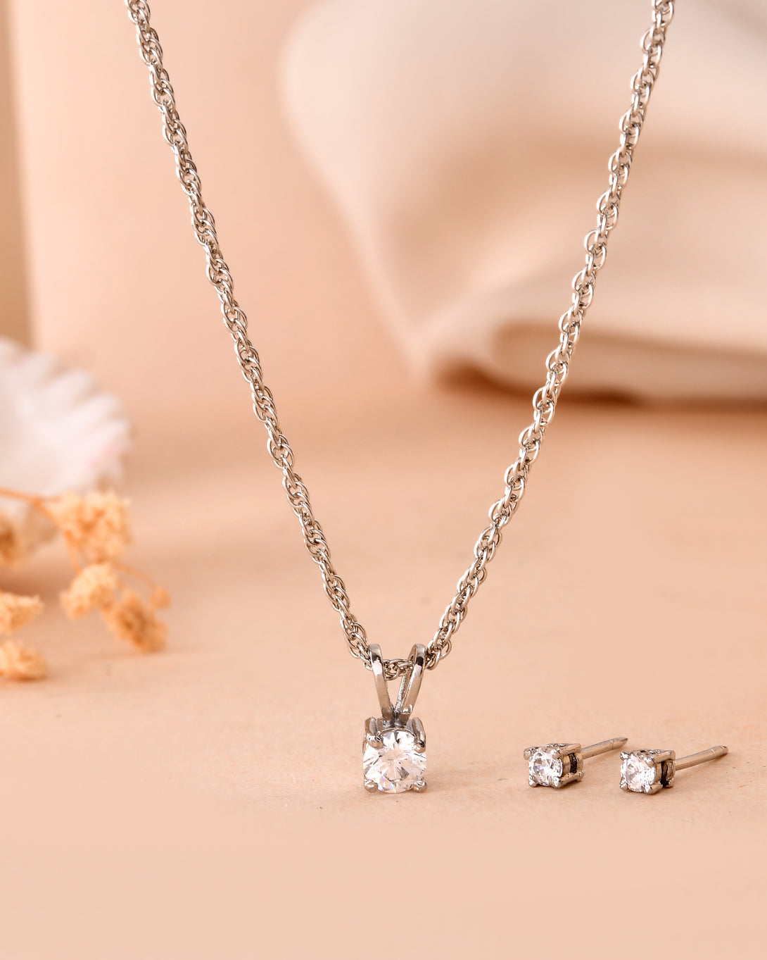 The Classic Solitaire Pendant Set is a symbol of understated elegance. Featuring a brilliant round-cut CZ solitaire pendant paired with matching stud earrings, this set is crafted in 925 Sterling Silver with rhodium plating for a refined finish. Perfect for everyday wear or as a meaningful gift, it is a versatile must-have that never goes out of style.