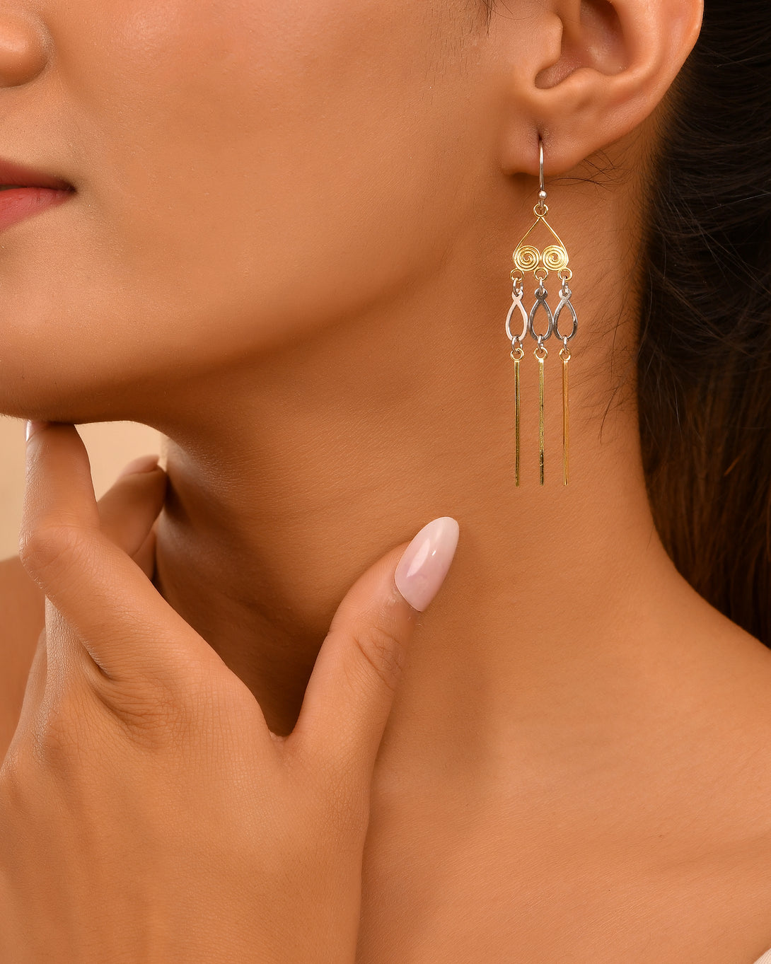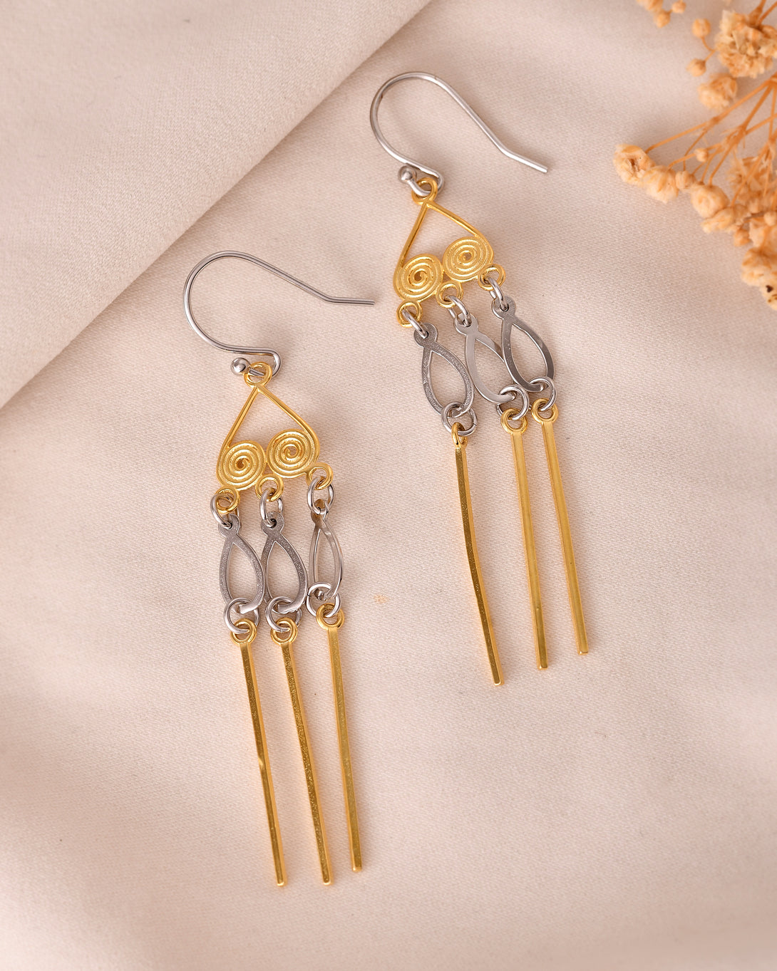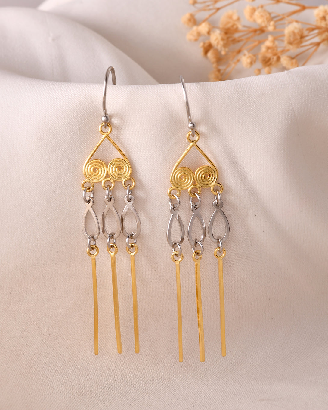 The Dual-Tone Spiral Dangler Earrings bring an artistic edge to your accessory game. Featuring handcrafted