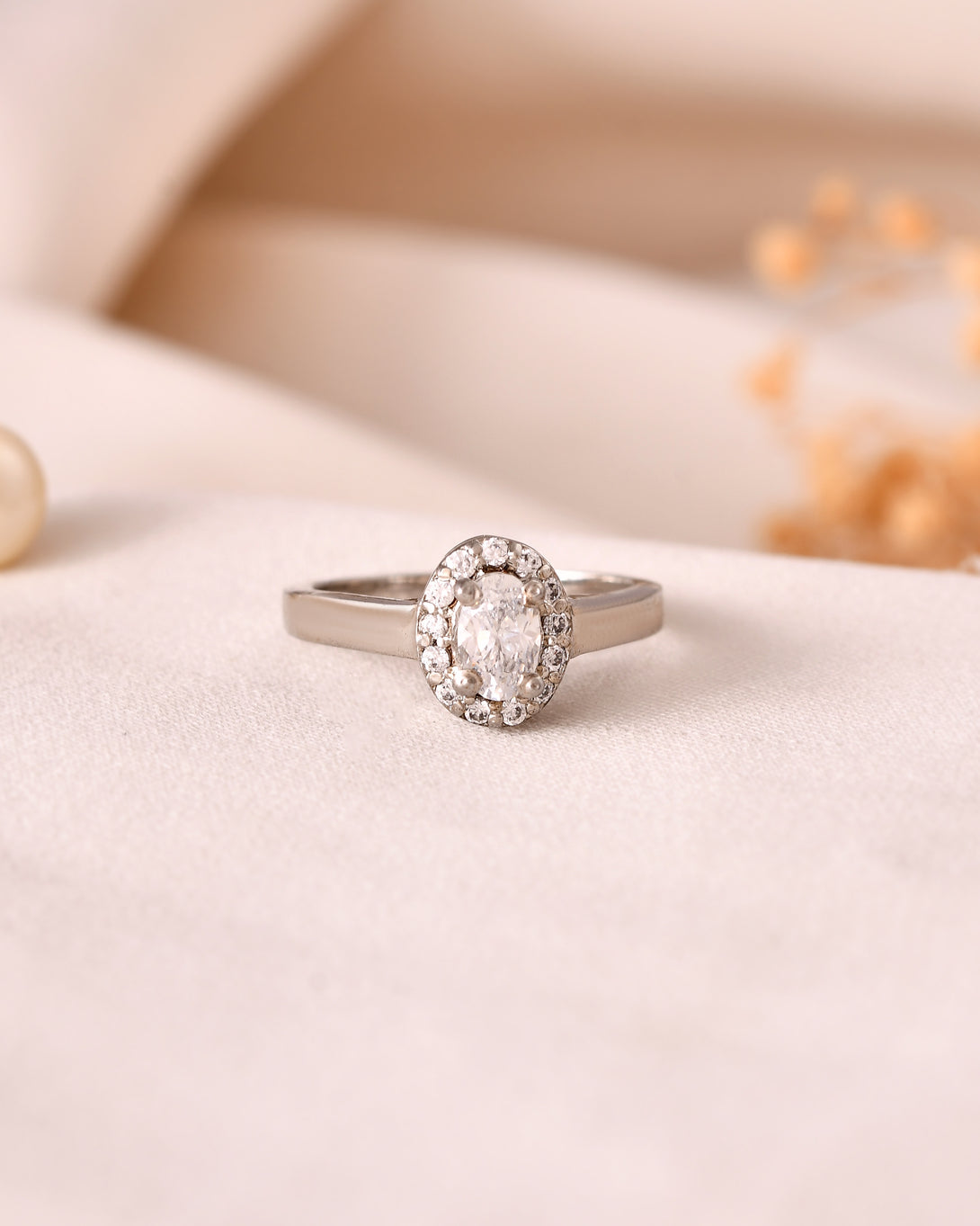 The Eternal Halo Oval Ring is a classic expression of elegance. Featuring a sparkling oval-cut cubic zirconia