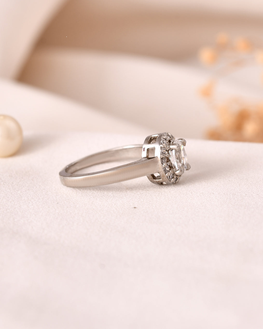 center stone encircled by a radiant halo of smaller stones, this ring is crafted in 925 Sterling Silver with rhodium