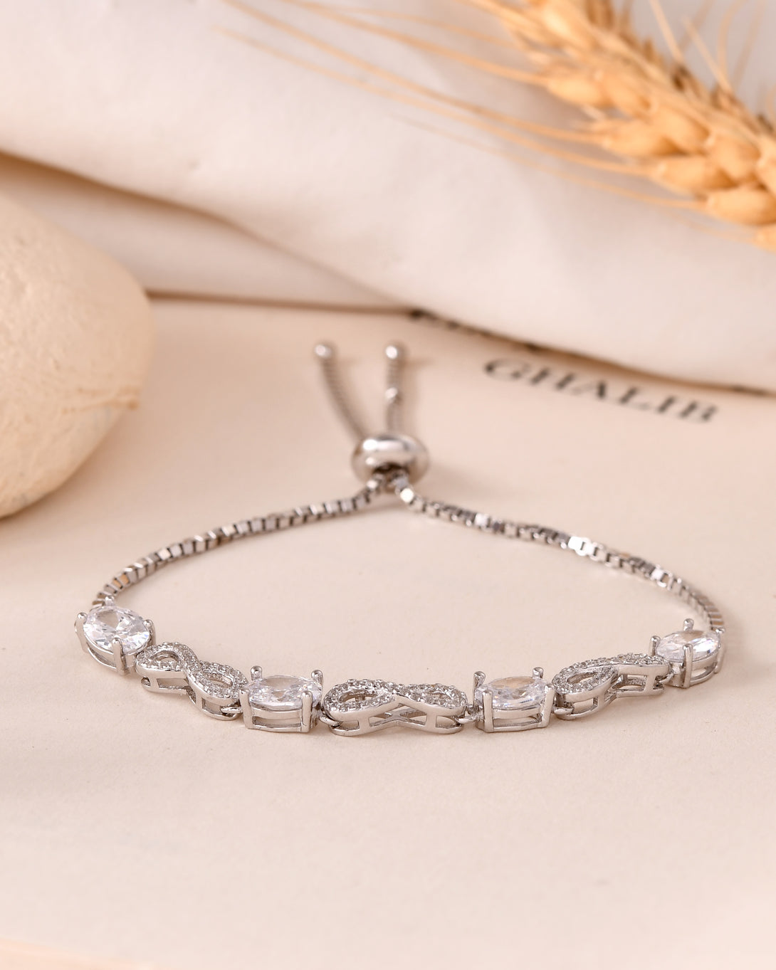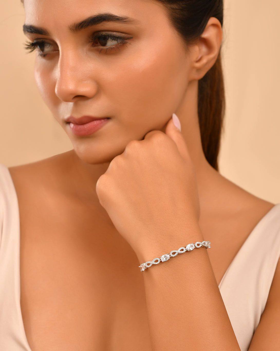 The Eternal Spark Infinity Bracelet blends symbolism and elegance. Featuring alternating oval-cut cubic zirconia