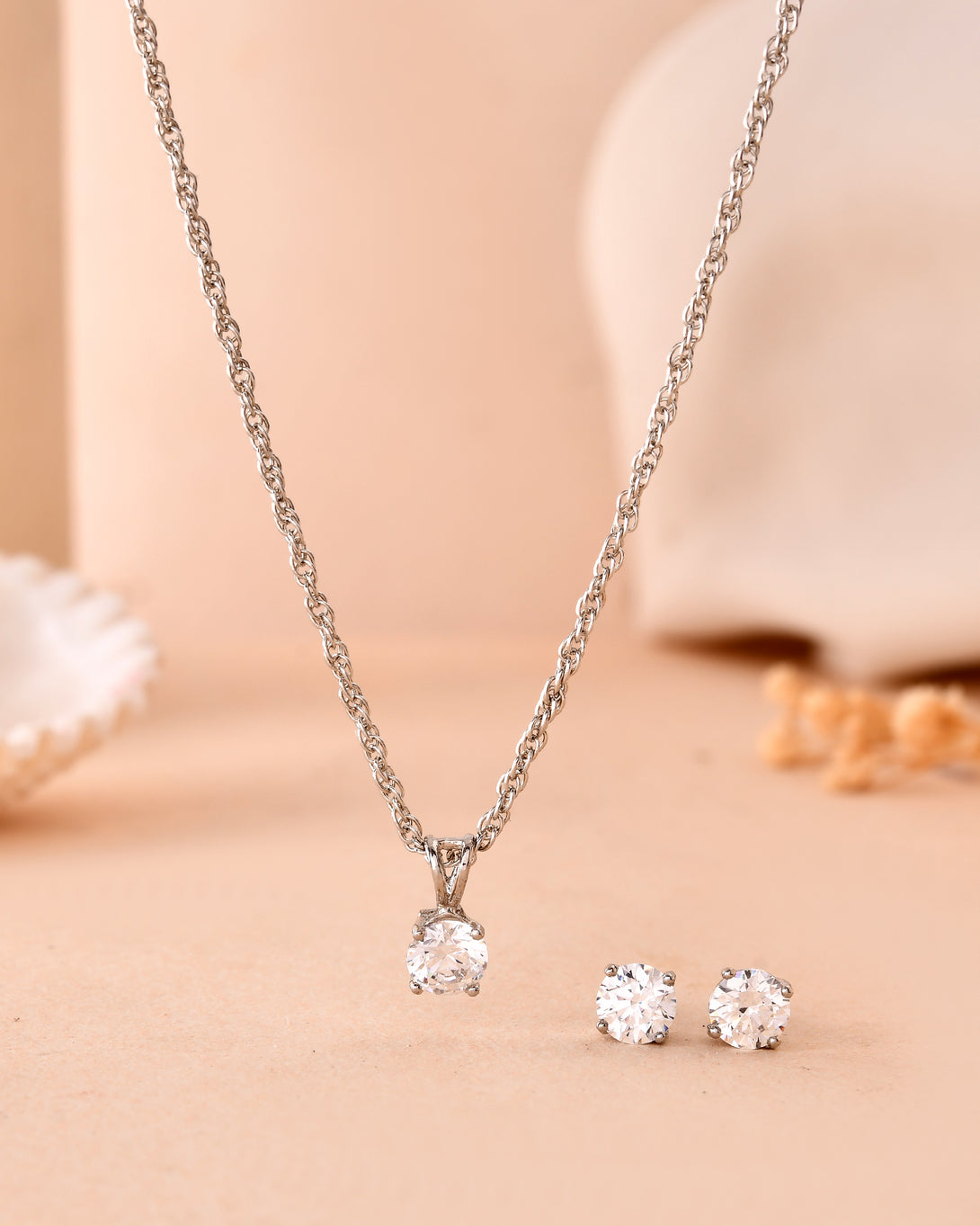 The Forever Spark Solitaire Pendant Set is a timeless treasure that radiates elegance. Showcasing a brilliant round-cut CZ solitaire pendant with perfectly matching stud earrings, this set is crafted in 925 Sterling Silver with rhodium plating for a luxurious shine. A versatile design that pairs effortlessly with any outfit, making it a thoughtful gift or a personal essential for everyday sophistication.