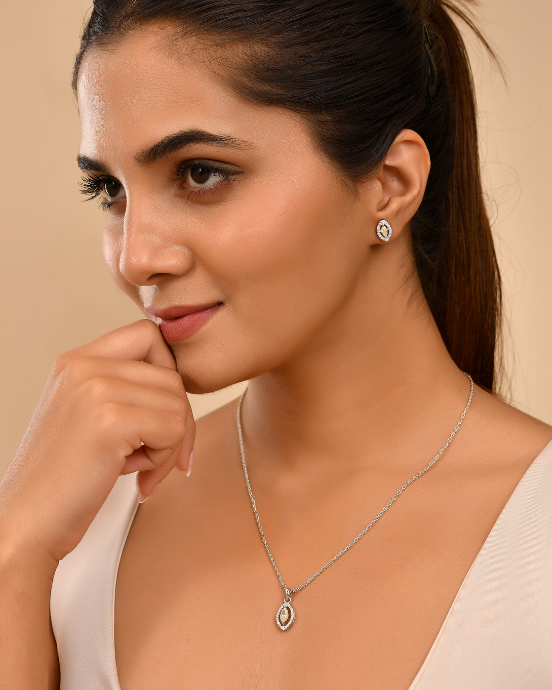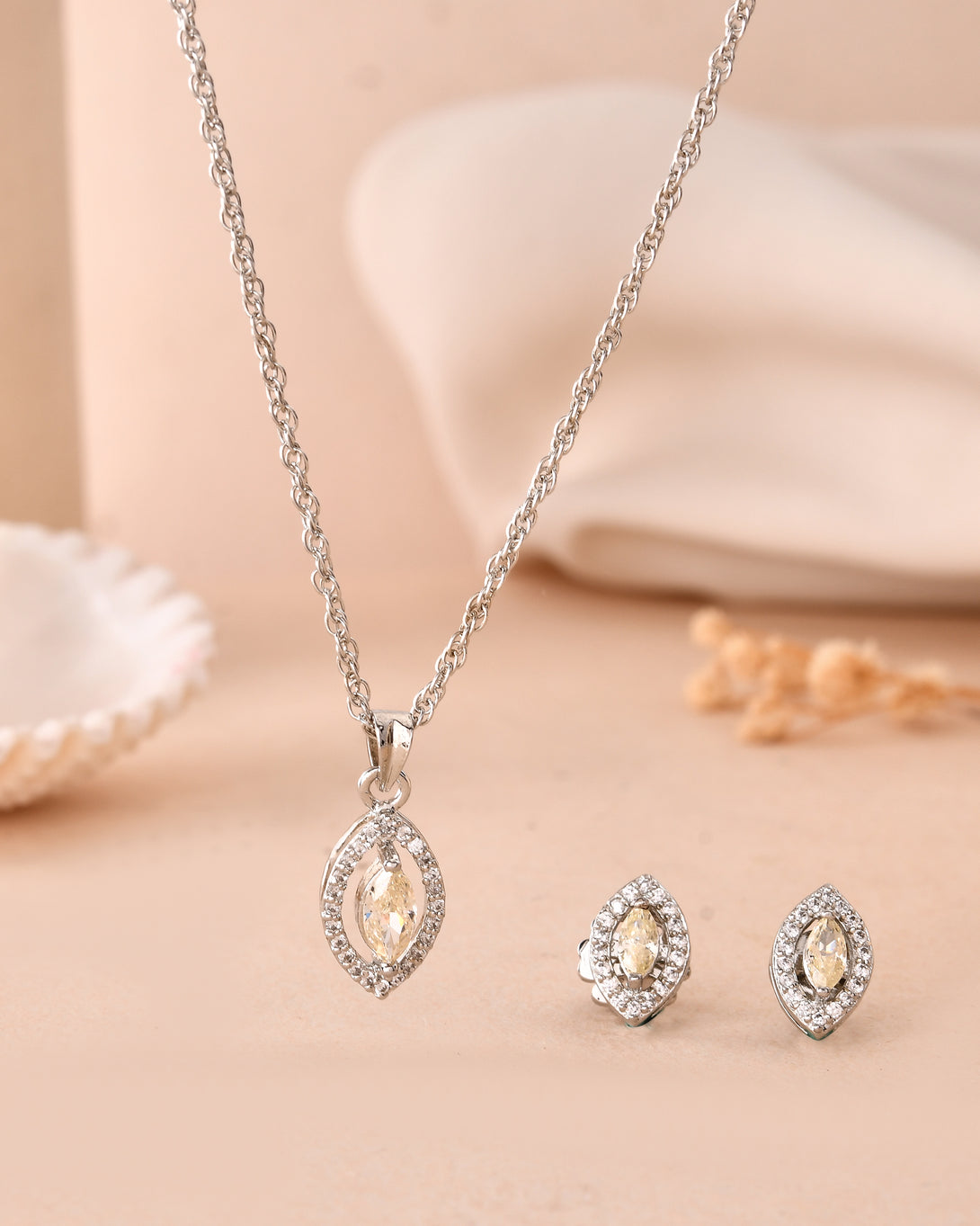 sparkling zircon halos. Crafted in 925 Sterling Silver with rhodium plating, this matching necklace and earrings