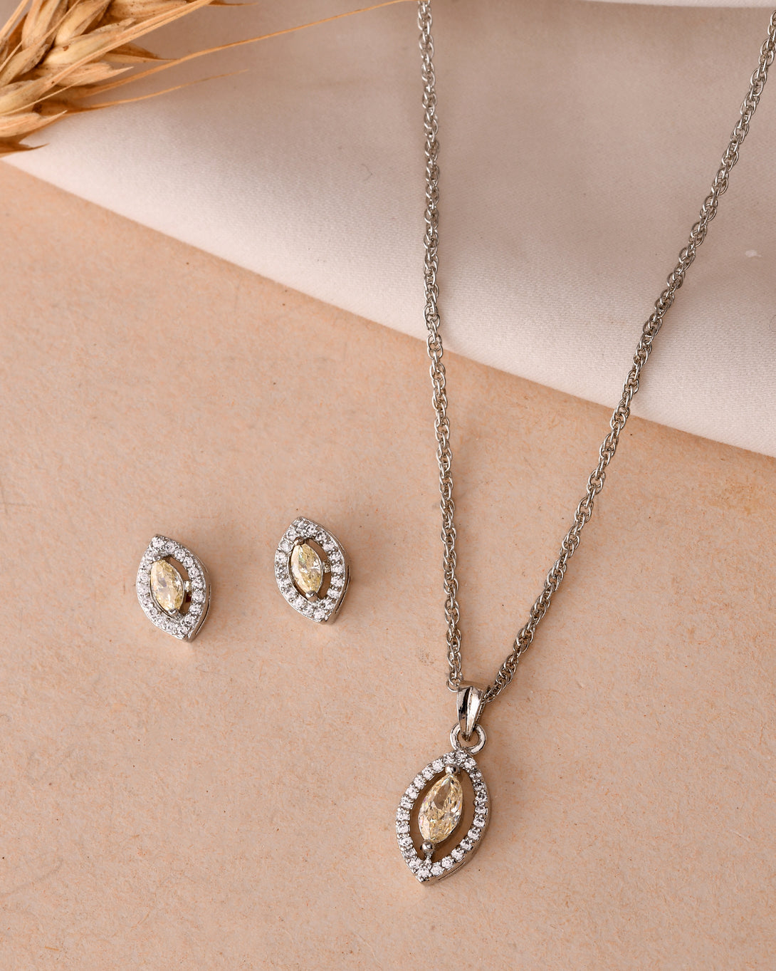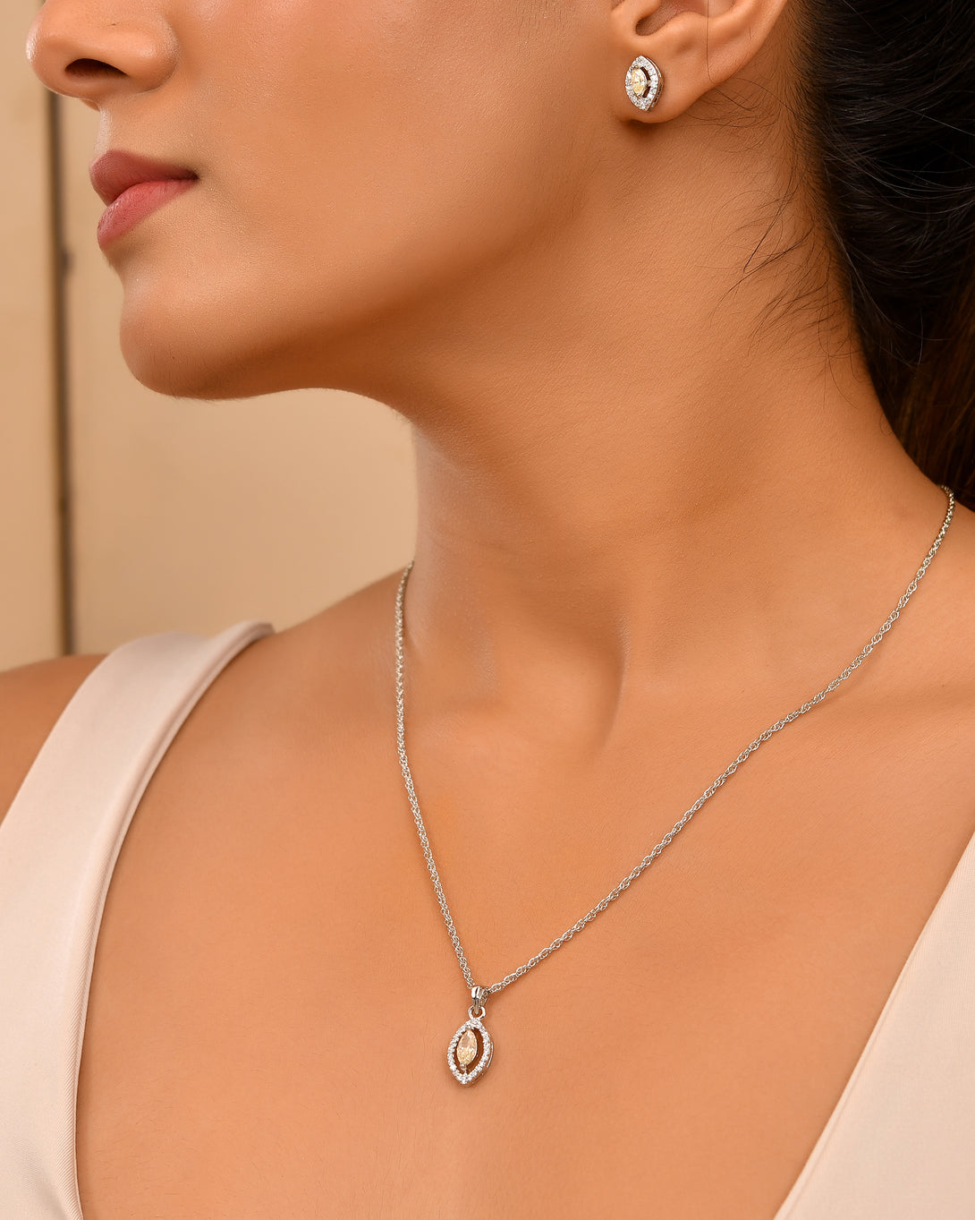 The Golden Marquise Halo Set exudes grace with its marquise-cut golden simulated gemstones, surrounded by