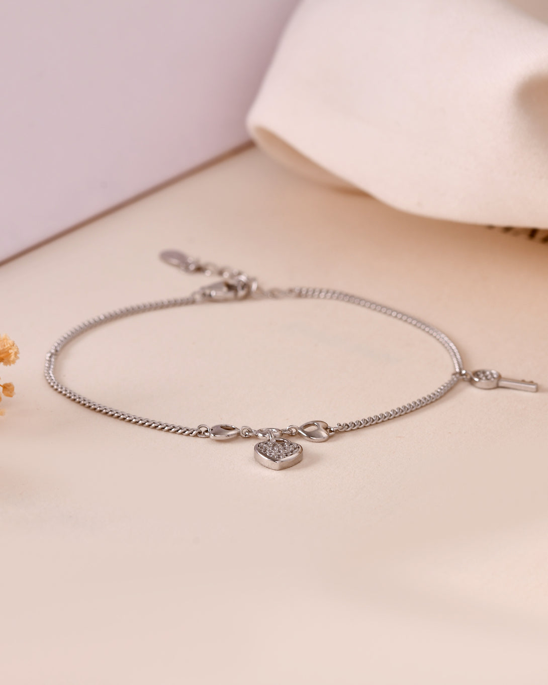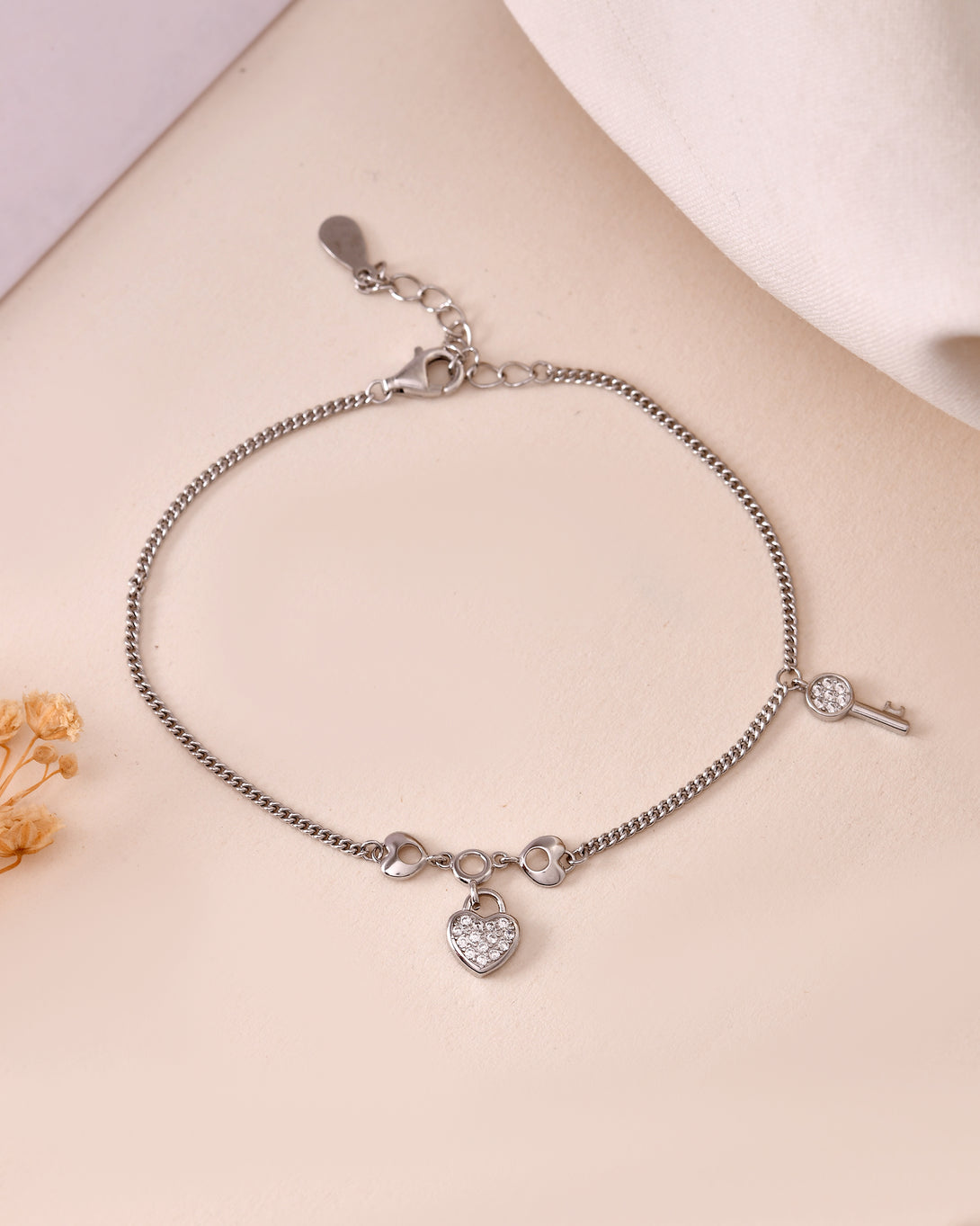 The Lock & Key Heart Charm Bracelet is a symbol of love, trust, and connection. Featuring a sparkling pavé heart