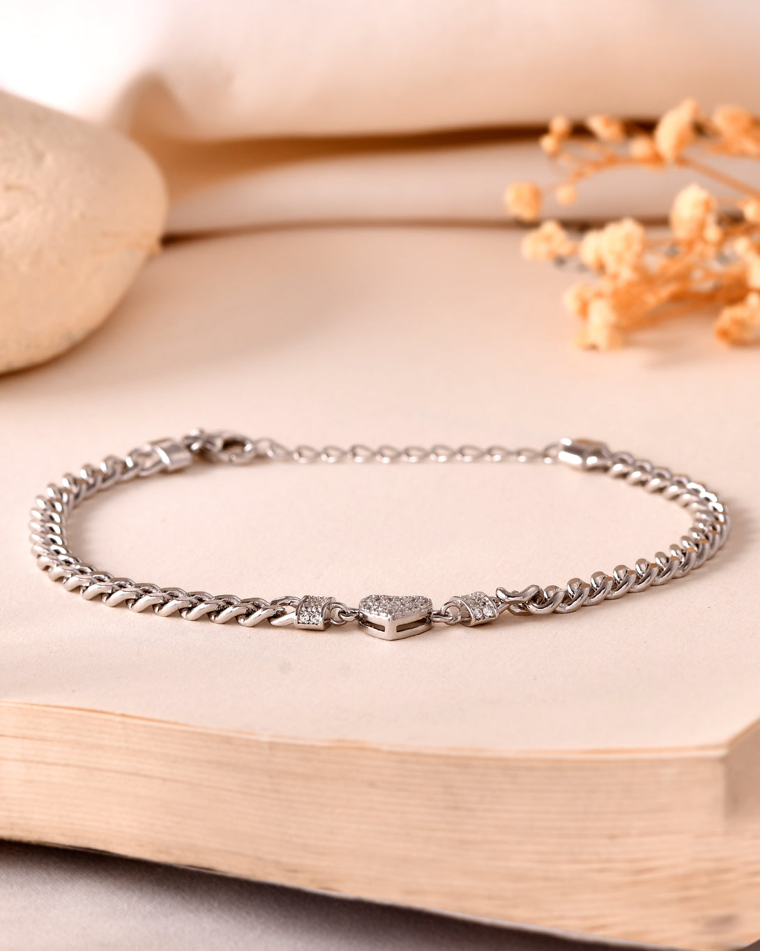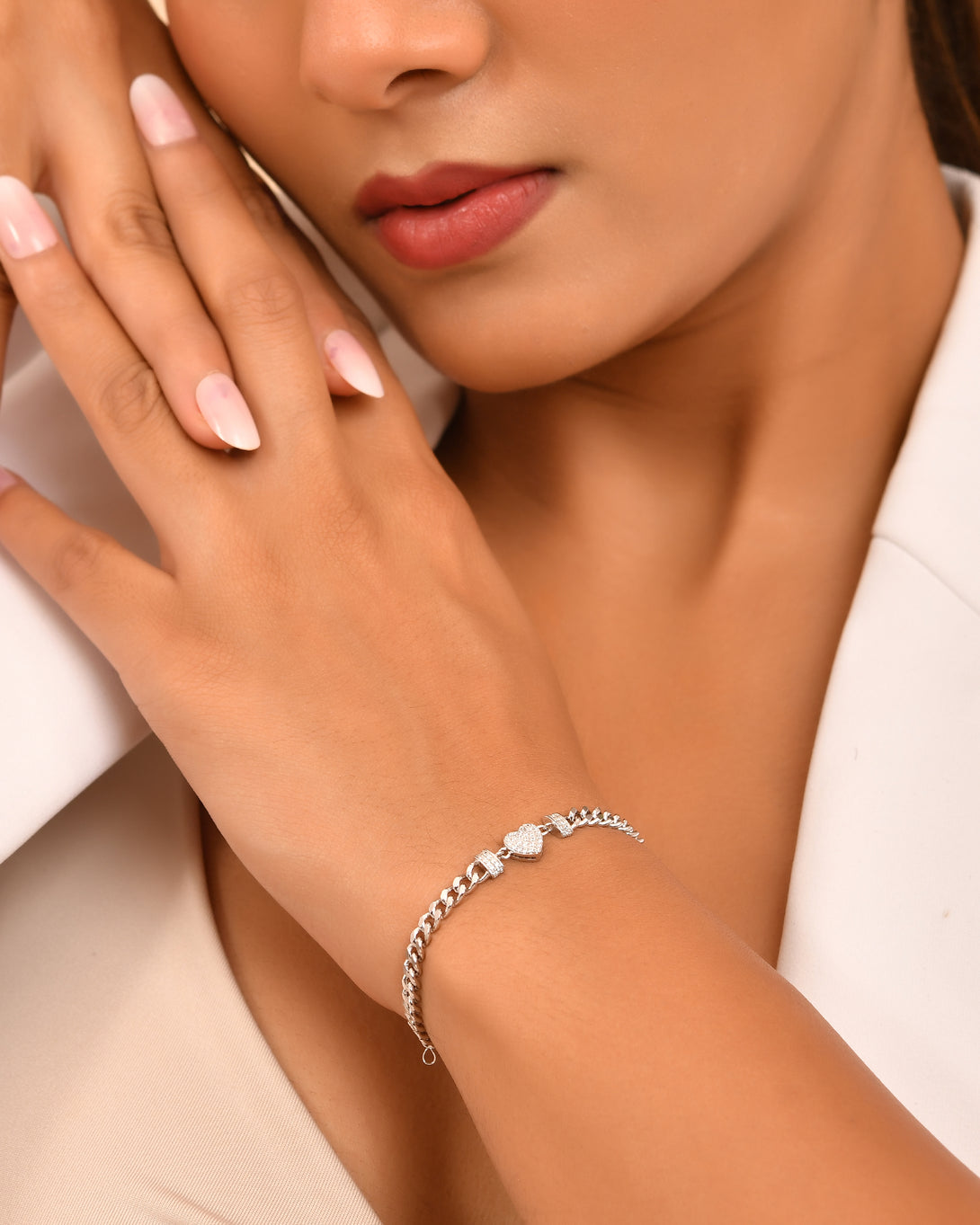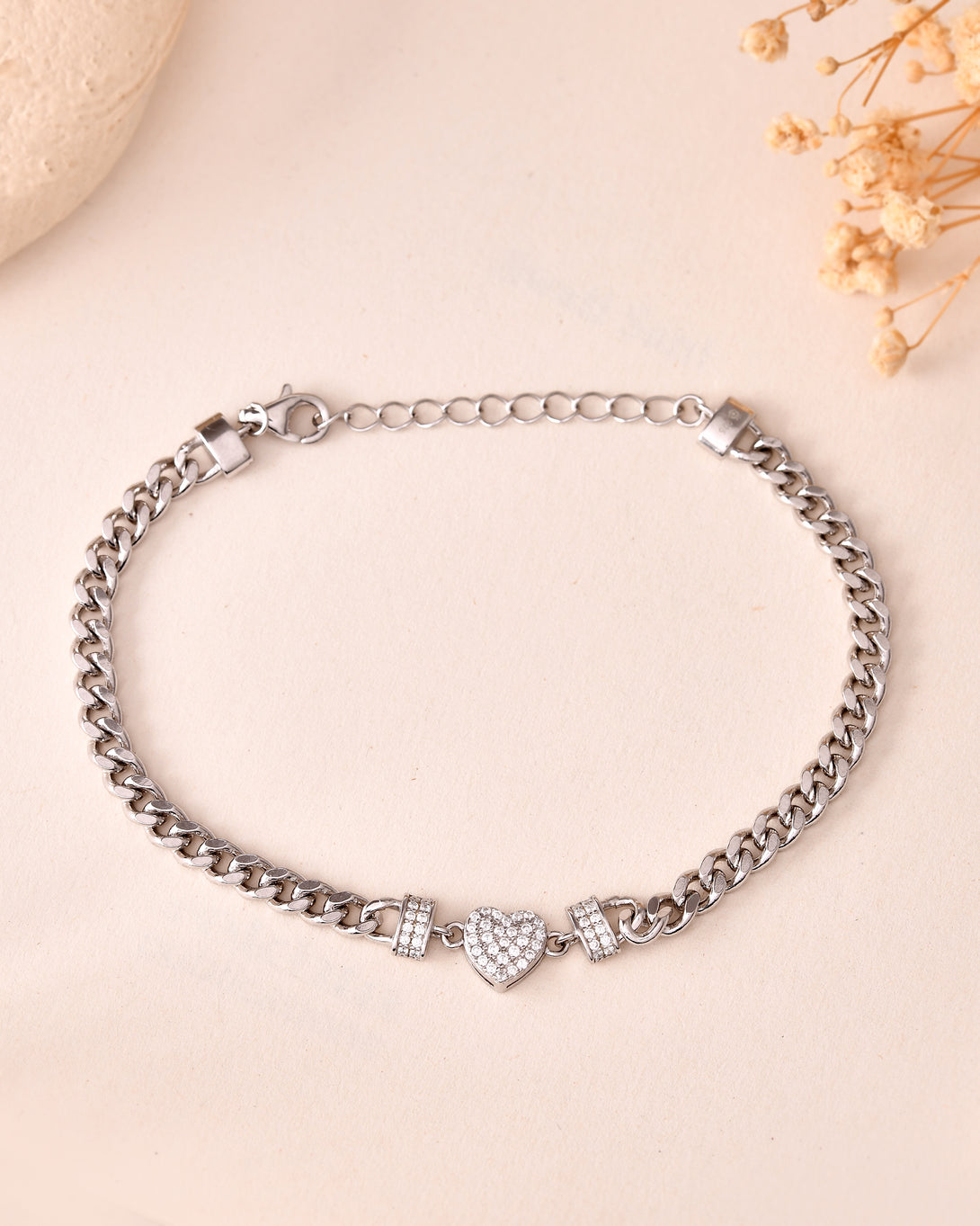 The Pavé Heart Chain Bracelet blends boldness with romance. Featuring a sparkling pavé-set heart at the