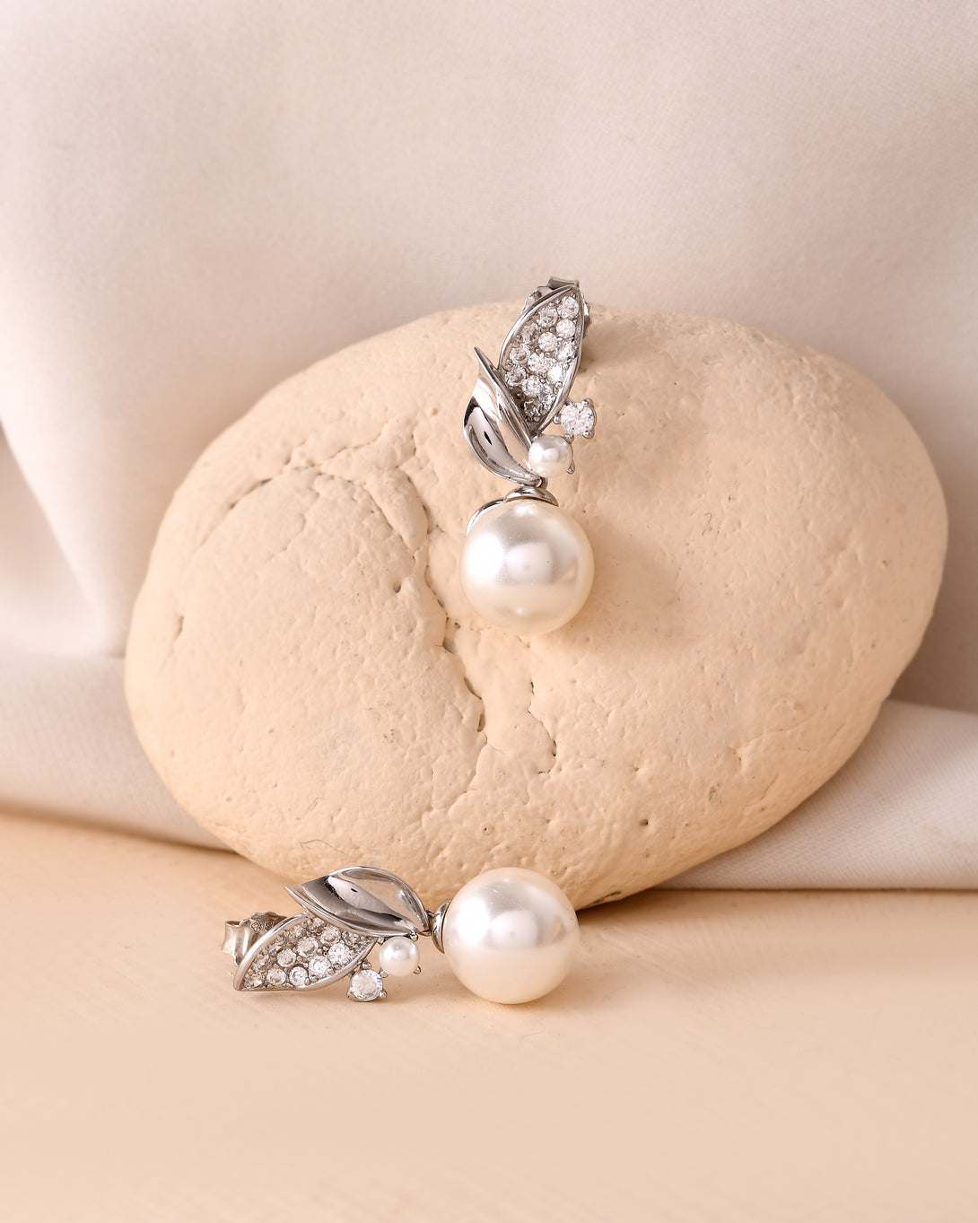 pearls accented by sparkling cubic zirconia leaves, these earrings are crafted in 925 Sterling Silver with rhodium
