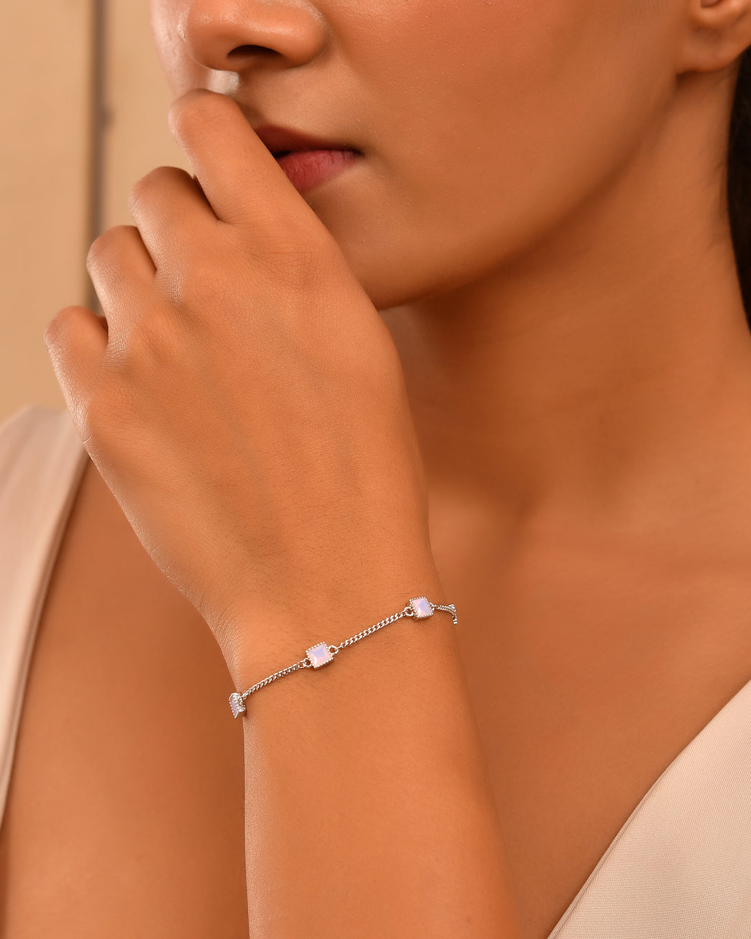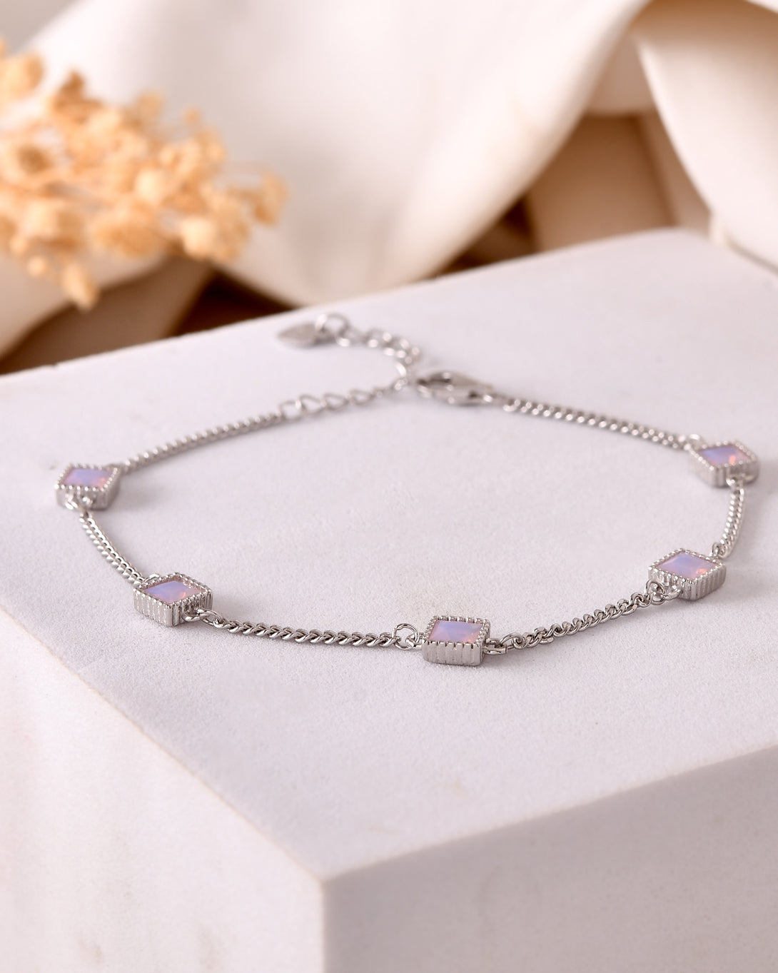 square-cut pink opal stones evenly spaced along a fine silver chain, this bracelet adds a gentle pop of color while
