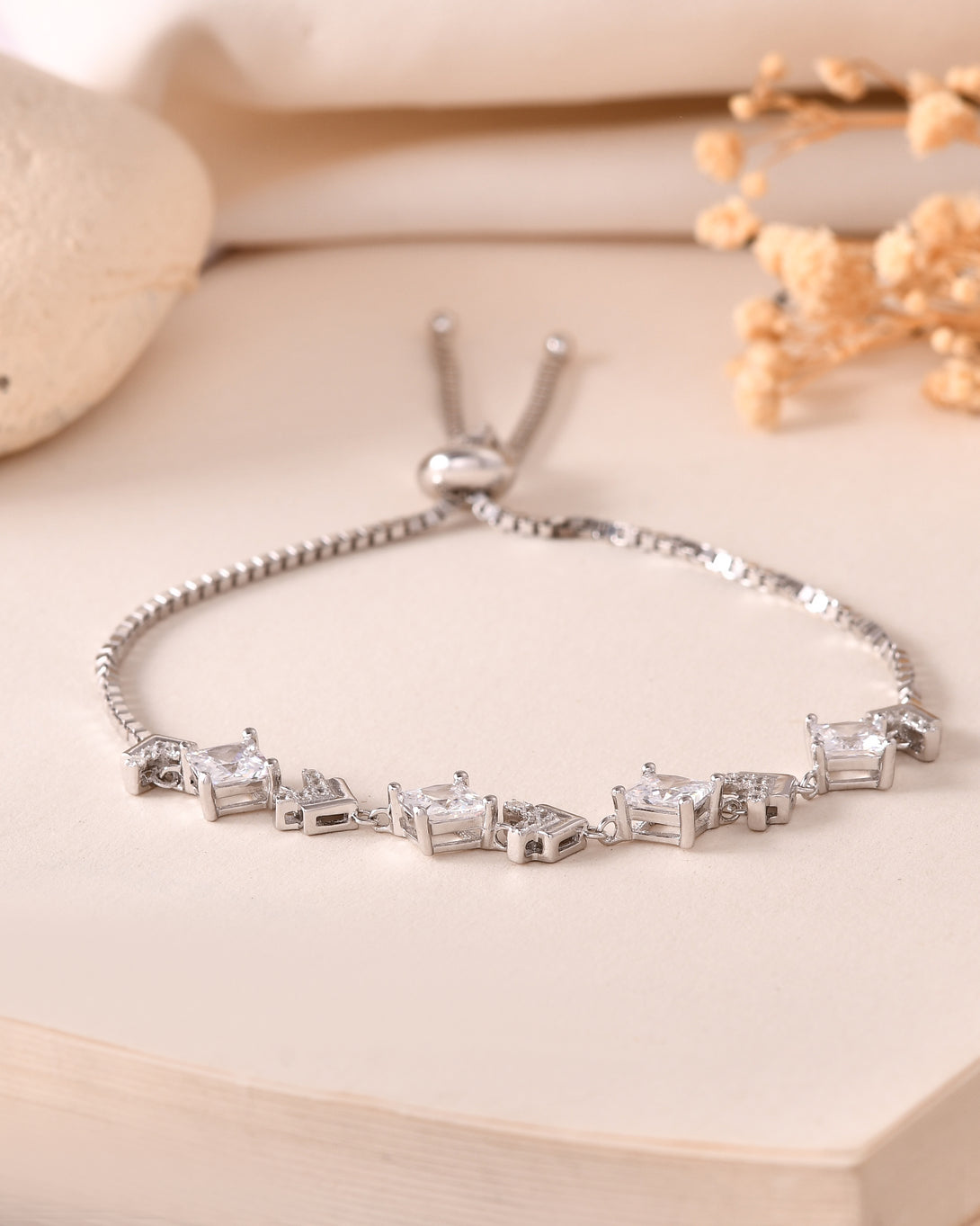 The Radiant Square Charm Bracelet features alternating princess-cut cubic zirconia set in a sleek adjustable