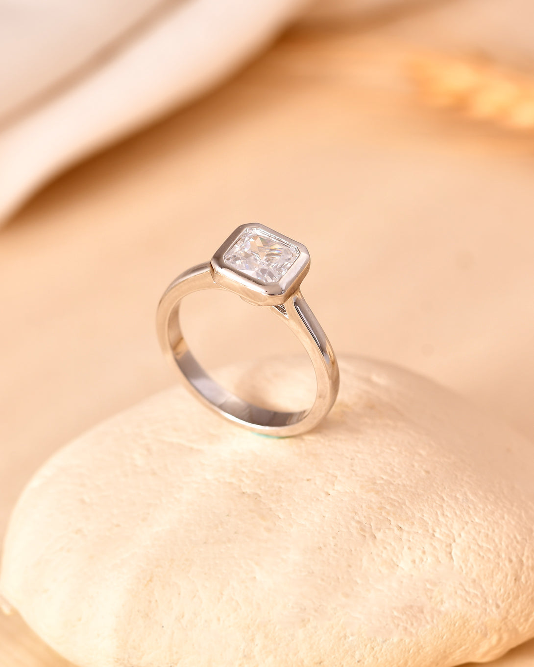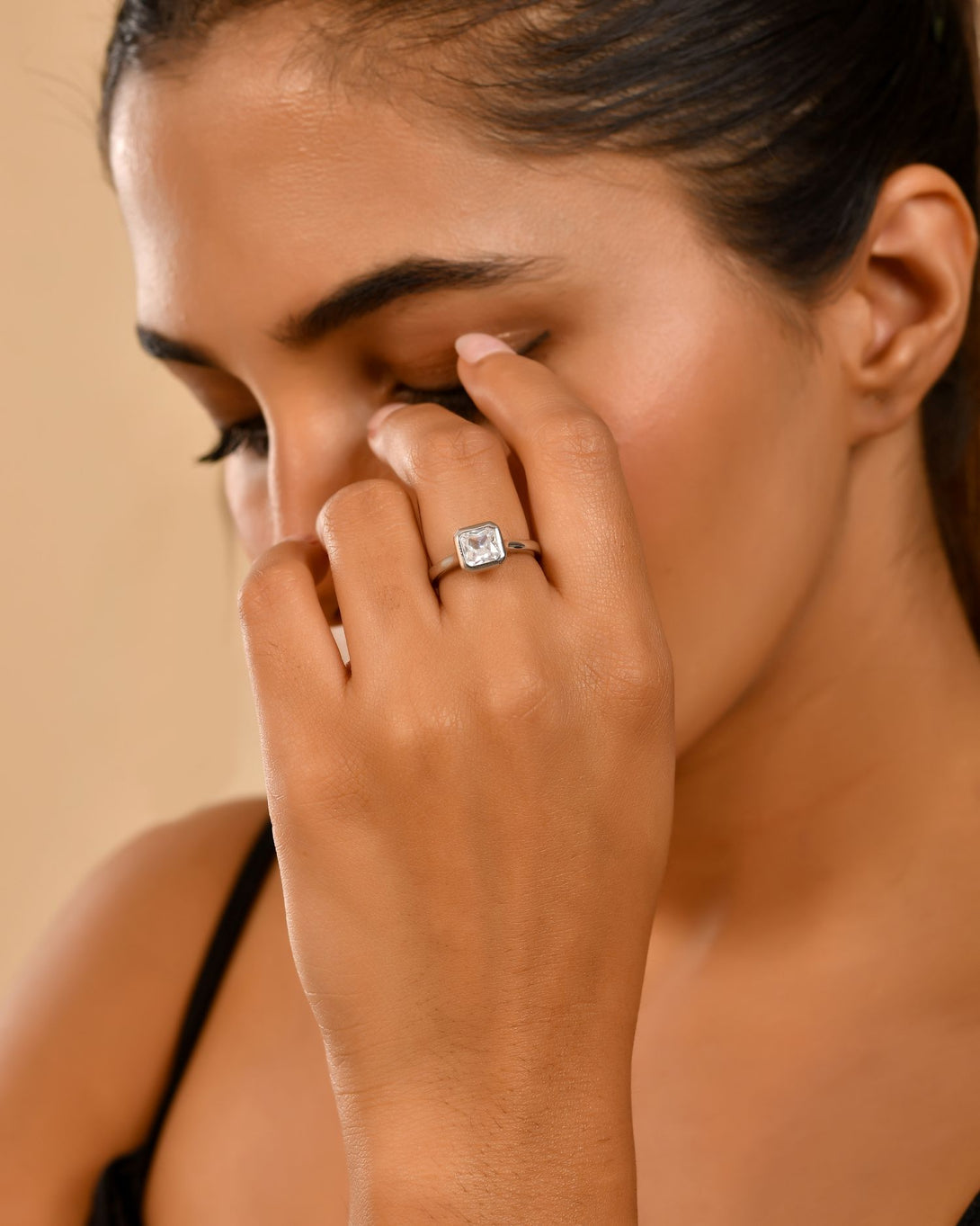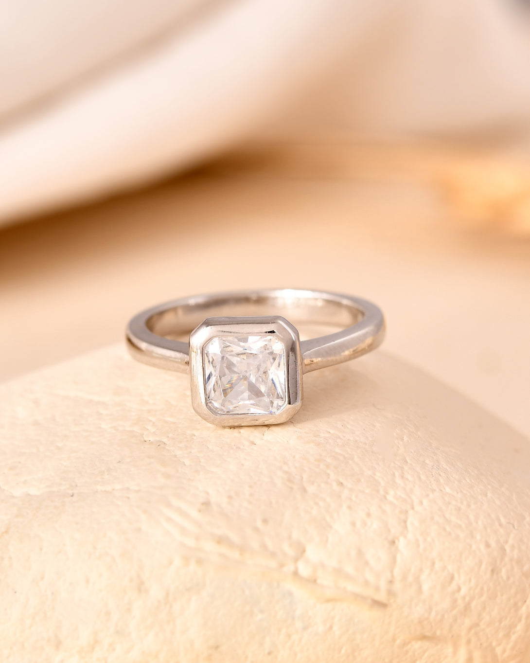 The Regal Solitaire Square Ring is a modern classic, featuring a striking square-cut clear gemstone set in a