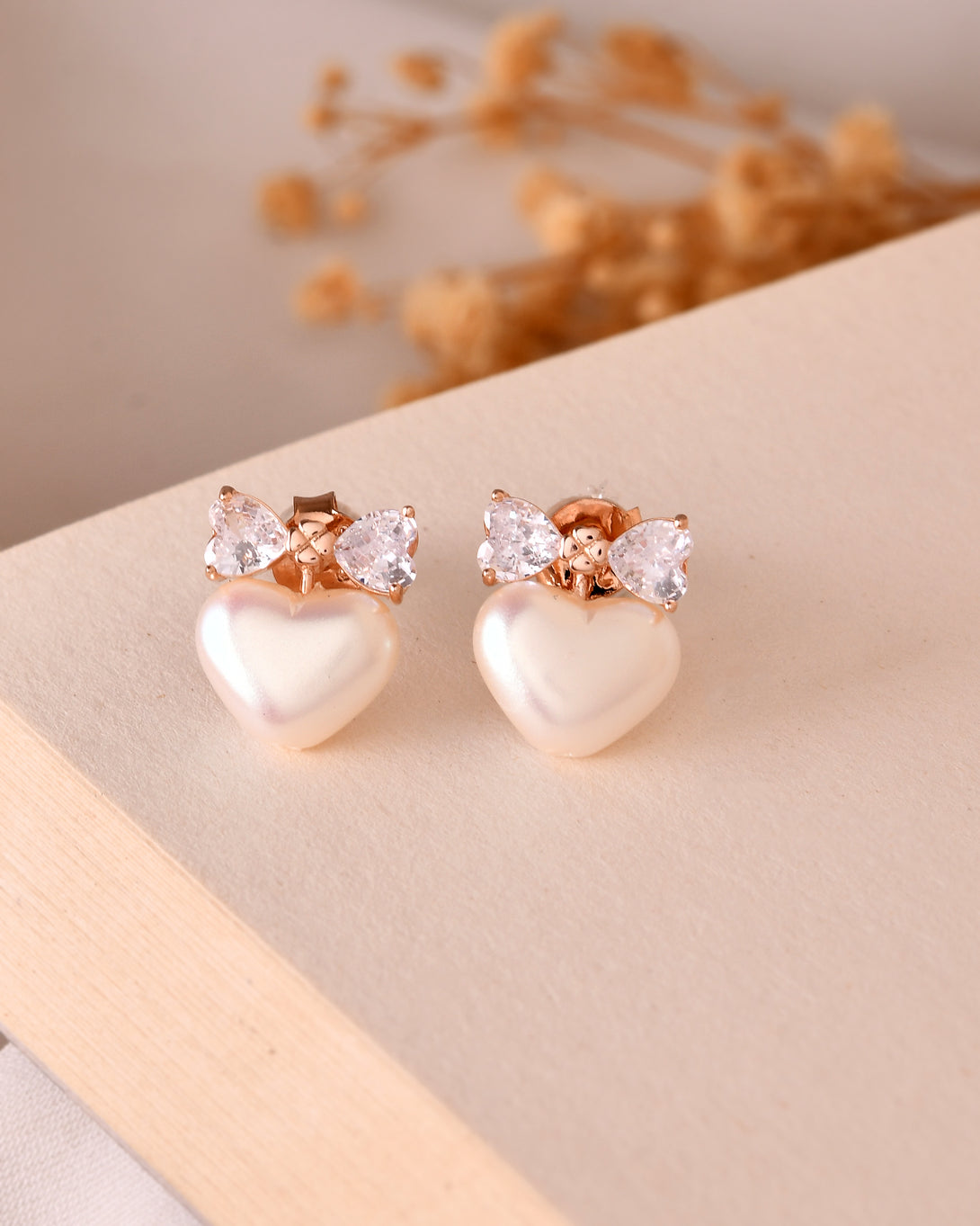 The Rose Gold Pearl Heart Bow Earrings are a romantic fusion of elegance and charm. Featuring lustrous heart