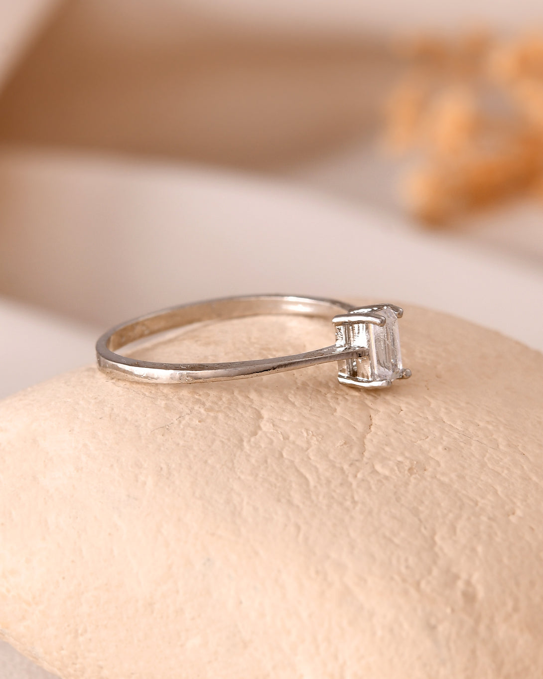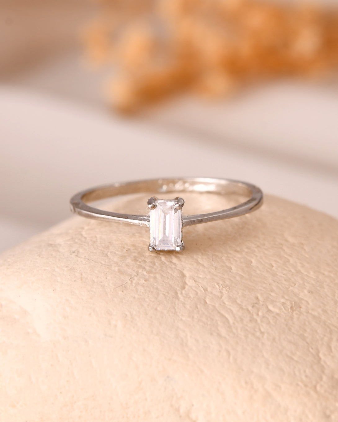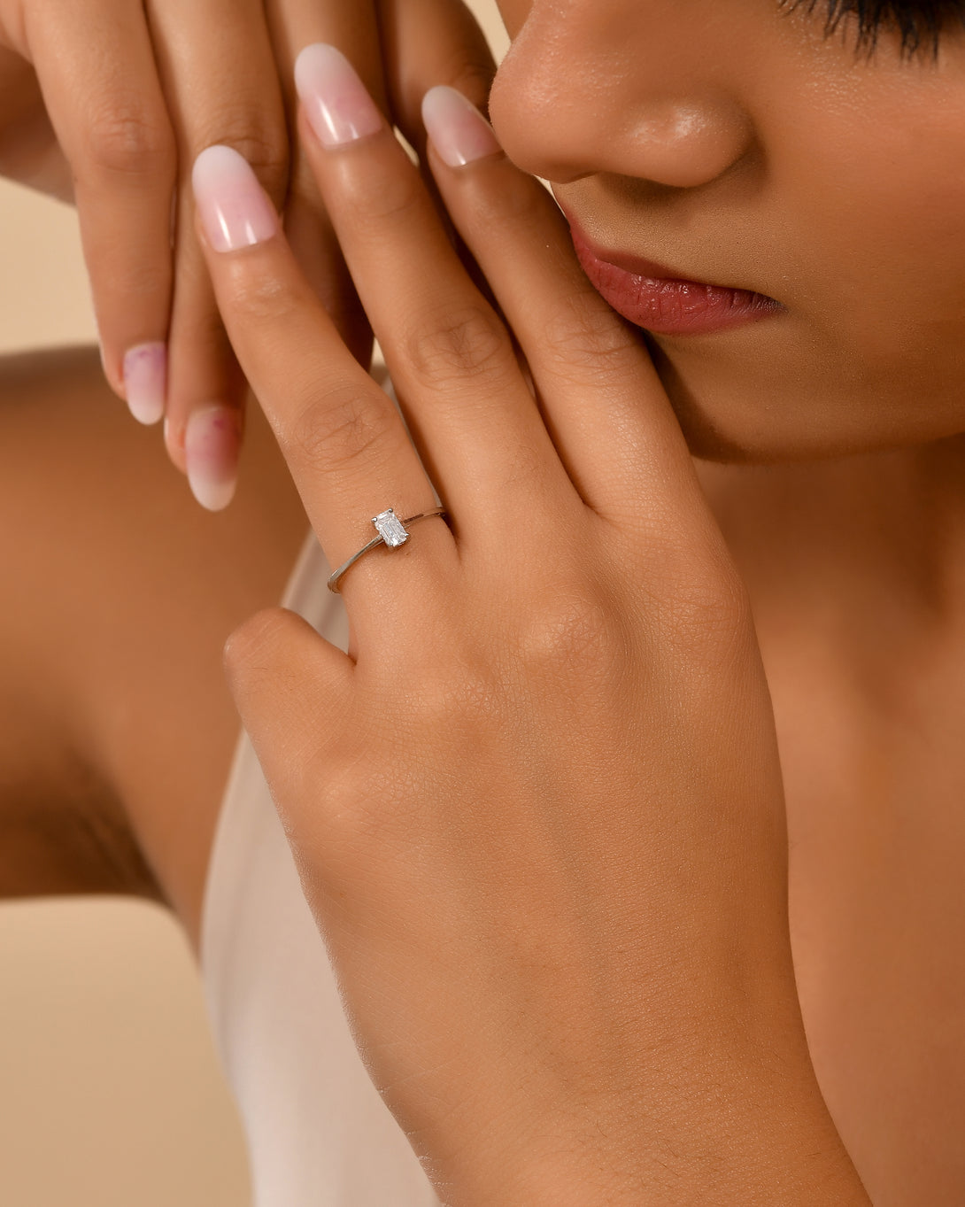 The Sleek Emerald Solitaire Ring is the definition of modern minimalism. Featuring a slender band with a